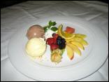 Pralinenparfait mit Himbeer-Orangensoße und Schlagrahm