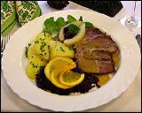 Knusprige Barbarie-Entenbrust an Organgensoße Mandelbällchen Apfelrotkohl